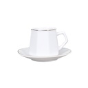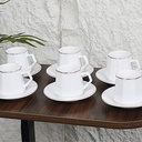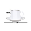 "A white ceramic coffee cup set consisting of 6 cups with saucers. Each cup has a capacity of 100 ml, with a saucer diameter of 11 cm. A modern and elegant design, perfect for enjoying coffee at home or during special occasions.